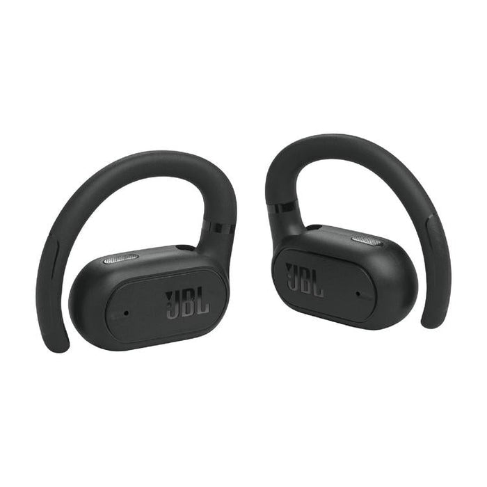 JBL Soundgear Sense earphones innovate with air conduction technology, perfect for sports. Powerful bass and IP54 resistance for your workouts. 24h total autonomy, fast charging and 4 microphones for clear calls. Intuitive touch controls and customization via the JBL app.